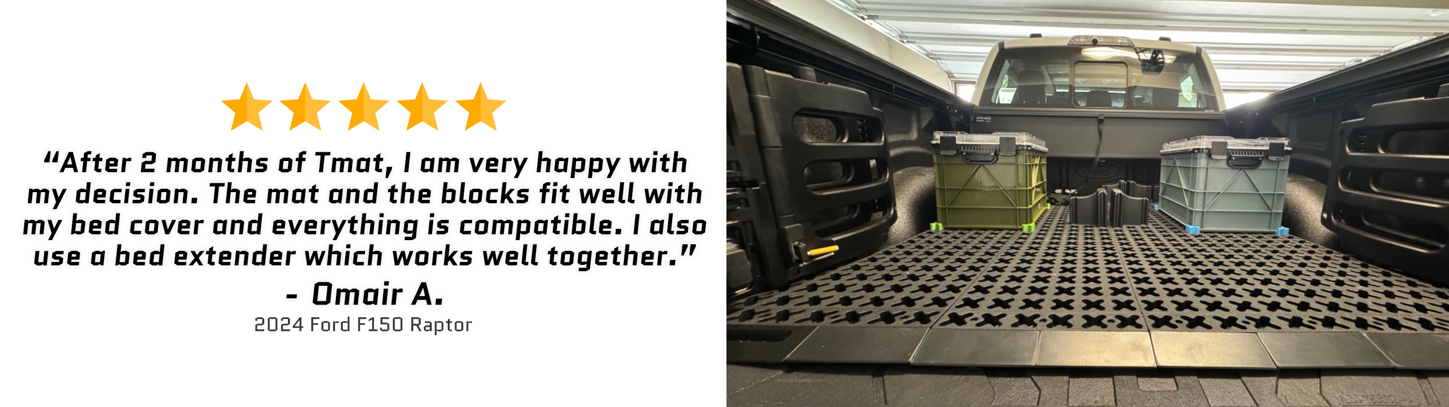 WARNING: Tmat is designed for enclosed and covered cargo areas such as covered truck beds, SUVs, vans, campers, and enclosed trailers. Extra precautions must be taken when used in an open-air cargo area to protect from wind and roll-overs. Tmat should never be used in an open-sided bed or with the tailgate down.